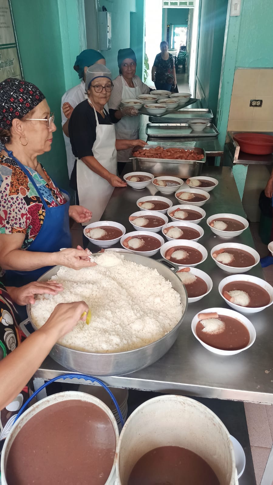 Después de la pandemia, la “clientela” se estabilizó en torno a los 800 almuerzos diarios, lo que supone un trabajo enorme: en primer lugar, asegurar los ingredientes mínimos (arroz, granos, algo de proteína) en cantidades industriales; pero además cocinar todo en inmensas ollas, servir durante tres horas en turnos de cien personas que caben en el lugar, lavar, limpiar, ordenar… ¿Cómo se logra todo esto? ¿Cómo se mantiene por un largo período de tiempo (ya más de 23 años)? Ese es el milagro de mucha fe, mucha perseverancia, mucha caridad de parte de los voluntarios y voluntarias, así como de algunos bienhechores.